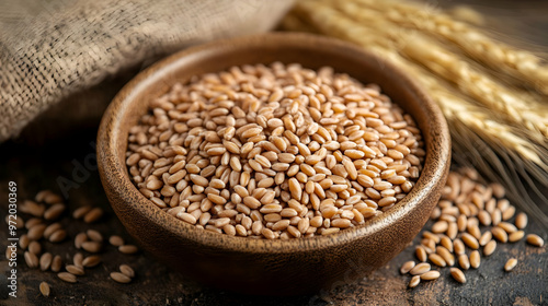 Organic Whole Wheat Grains in Wooden Bowl with Wheat Spikes