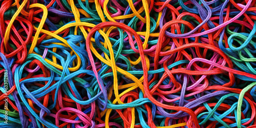 Organized Chaos: A neatly arranged mess of colored strings, yarn, and ribbons, seemingly forming a pattern or design.