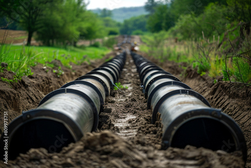 Organized efficiency in water flow management, a row of pipes positioned in soil, captured just before installation
