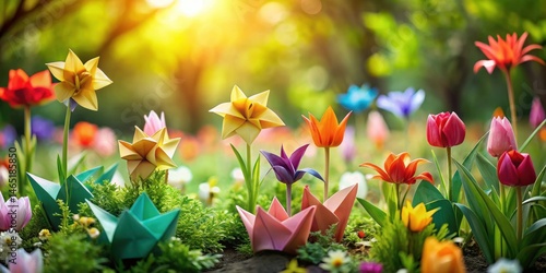 Origami flowers blooming in a tiny garden amidst lush greenery and vibrant blooms