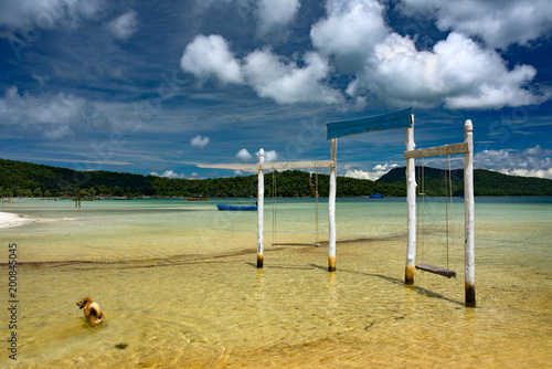 Original and stylish wooden swing standing in the water at the beach of Koh Rong Samloem tropical island. Saracen Bay, Cambodia.