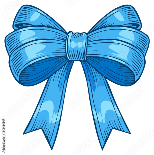 Ornate Blue Ribbon Bow with Sketchy Texture and Flowing Tails