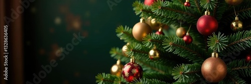 Ornate evergreen tree adorned with colorful red and gold ornaments, evergreen tree, ornamental tree