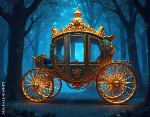 Ornate gold royal carriage with teal accents awaits in magical blue forest at night. Glimmering stars, ornate wheels create fantasy fairy tale scene. Luxurious vintage vehicle evokes opulence,