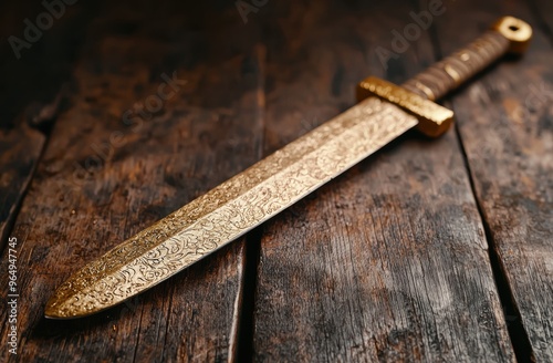 Ornate golden sword on wooden table