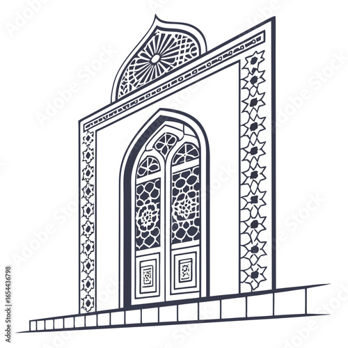 Ornate islamic archway with intricate geometric patterns and decorative door