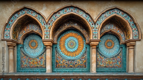 Ornate Mosaic Archway Wall Detail Featuring Colorful Tiles