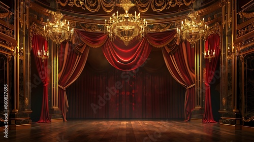 Ornate Theater Stage with Red Velvet Curtains and Golden Accents