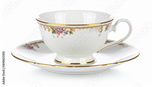 Ornate white porcelain teacup and saucer with a floral pattern and gold trim, embodying timeless elegance