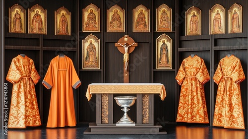 Orthodox Church Altar, Robes, Icons. Spiritual sanctuary, religious ceremony preparation