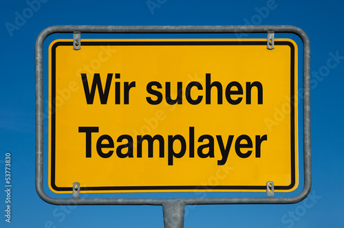 Ortsschild gelb WIR SUCHEN TEAMPLAYER