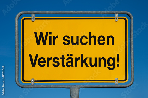 Ortsschild mit blauem Himmel WIR SUCHEN VERSTÄRKUNG!