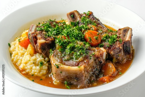 Osso Buco , A Milanese specialty of braised veal shanks cooked with white wine, broth, and vegetables, typically served with gremolata and risotto. Isolated on White Background