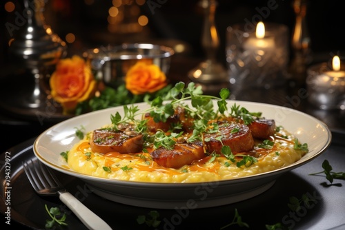 Ossobuco dish and turmeric risotto in elegant culinary scene., generative IA
