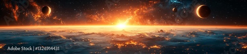 Otherworldly Eclipse Event with Fiery Planetary Orbits. Generative AI