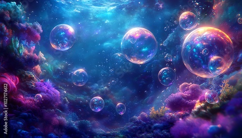 Otherworldly underwater world, showcasing a blend of reality and fantasy, where luminous creatures swim among swirling bubbles and vibrant corals