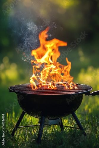 Outdoor grill with vibrant flames in a backyard setting during a sunny day
