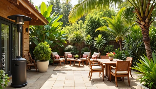 Outdoor heater in a tropical backyard with lounge seating – tropical comfort concept