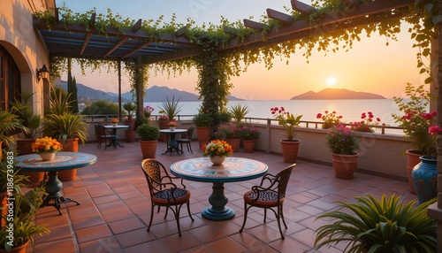 Outdoor Terrace with Sunset Ocean View and Mosaic Tables