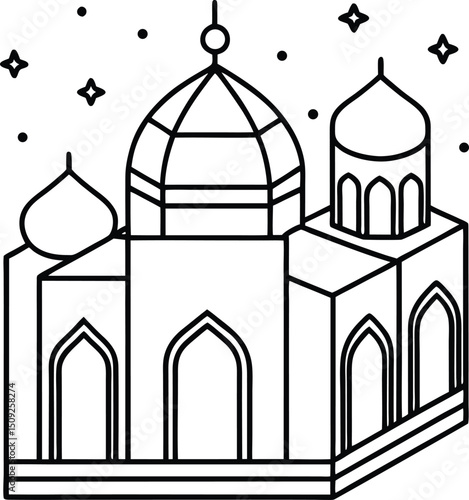 Outline Illustration of a Mosque with Stars in the Background Night Sky