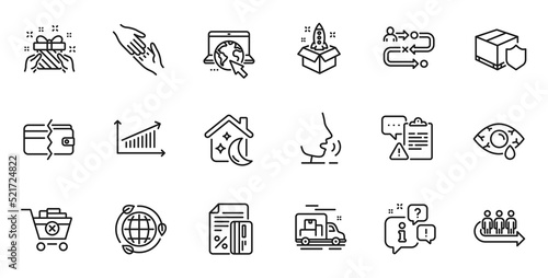 Outline set of Queue, Helping hand and Sleep line icons for web application. Talk, information, delivery truck outline icon. Include Journey path, Clipboard, Payment methods icons. Vector