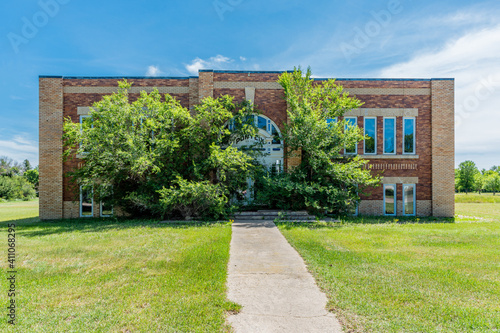 Overgrown plants covering the entrance to the abandoned Ponteix School in Ponteix, Saskatchewan, Canada