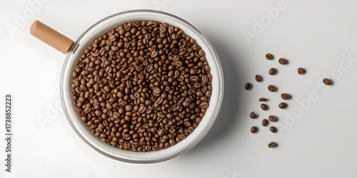 Overhead shot of coffee beans in a glass bowl and scattered on a white surface