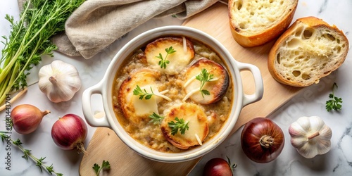 Overhead View of French Onion Soup with Toasted Bread, Melted Cheese, and Parsley, French Onion Soup, French Cuisine, Soup Recipes