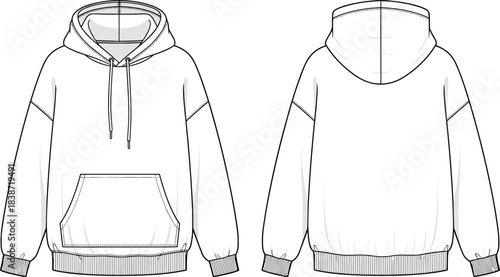 Oversized Casual Streetwear Hoodie Technical Fashion Sketch Flat Drawing for Clothing Design Garment Blueprint Template Baggy Silhouette Front and Back View Unisex Apparel Mockup