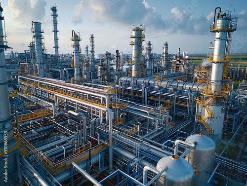 Overview of Industrial Oil Refinery Complex With Pipelines and Towers in Bright Daylight