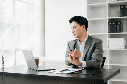 Overworked young Asian businesswoman office worker suffering from neck pain after had a long day at office desk. office syndrome concept..