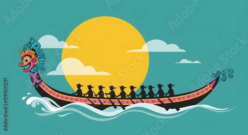 Pacu Jalur Water Sports in Indonesia Aura farming Boat Artistic Illustration of a Traditional Longboat with Rowers Set Against a Sunny Backdrop in Turquoise