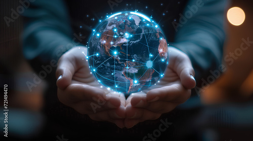 Pair of hands holding a transparent globe with digital connections and nodes superimposed over it, representing a network, global communication