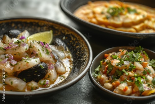 Pair of Peruvian ceviche with black shells and traditional fish ceviche