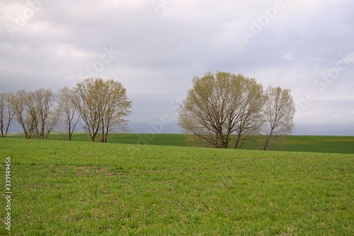 Paisaje de prado verde con arboles y cielo nuboso