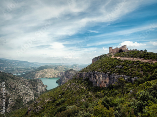 Paisaje desde lo alto con el rio y el castillo de Chirel perteneciente a Cortes de Pallas situado por la provincia de Alicante en España