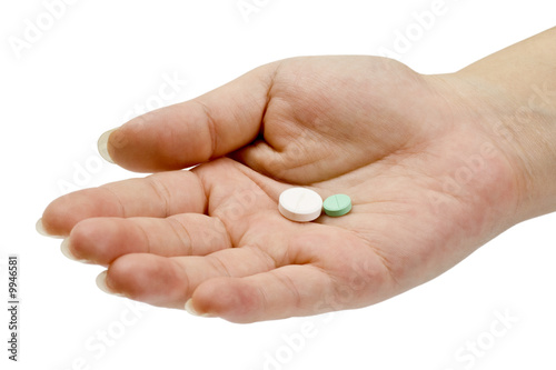 Palm holding pills isolated on white background.