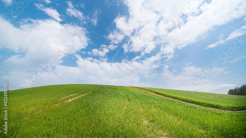 Panorama of a green field with white clouds in the sky. Summer rural landscape on a sunny day