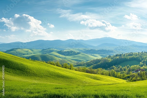 panorama of beautiful countryside of romania. sunny afternoon. wonderful springtime landscape in mountains. grassy field and rolling hills. rural scenery