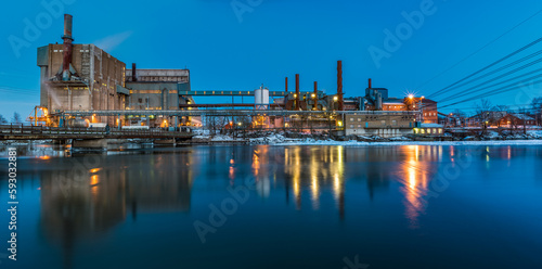 Panorama of Illuminated Factory Skyline at Dusk in Sweden