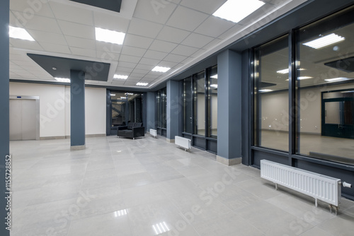 panorama view in empty modern hall with columns, doors and panoramic windows at night