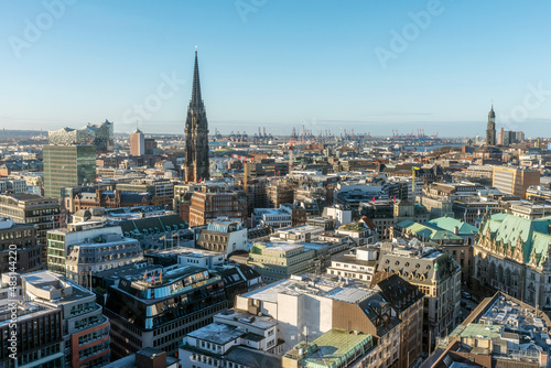 Panoramaaufnahme von Hamburg, mit der Hamburger City und dem Mahnmal St. Nikolai an einem kalten WIntertag mit blauem Himmel