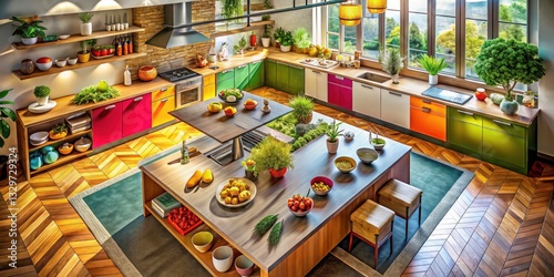 Panoramic Aerial Kitchen Photography: Vibrant Ingredients, Culinary Art