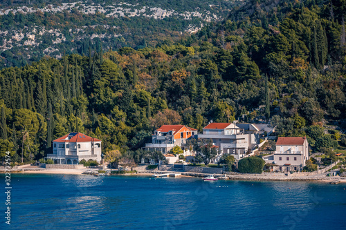 Panoramic landscape of mediterranean town on a sandy seacoast, deep blue sea on foreground, small houses with red tiled roofs situated on the shore, hills on background
