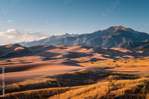 Panoramic photograph of the Great Sand Dunes in Colorado, with a mountain range in the background