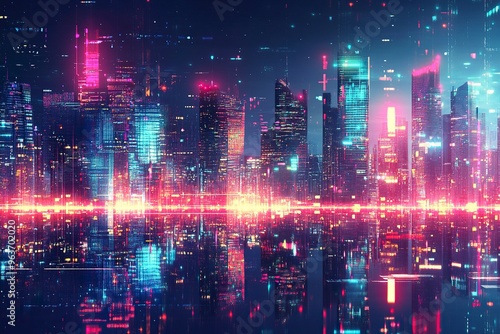 Panoramic urban architecture, cityscape with space and neon light effects. Modern hi-tech, science, futuristic technology concept. generative ai