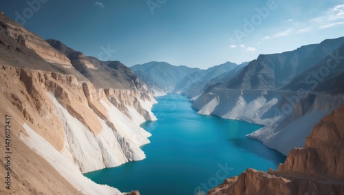 Panoramic view of a low water level strip on a cliff by the lake from the dam at the border