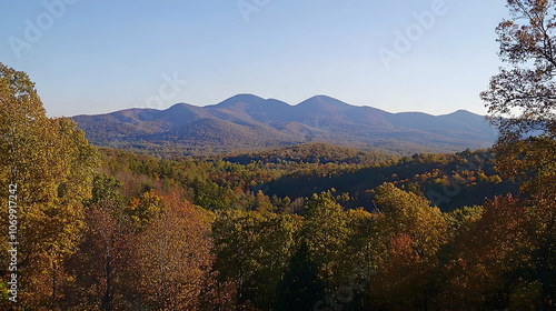 Panoramic view of a mountainous landscape with fall foliage in the foreground.