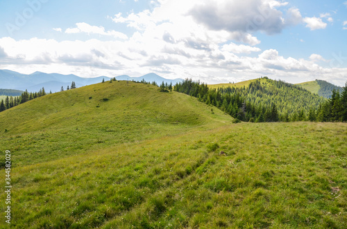 Panoramic view of green grassy valley, high Carpathian mountains near green trees against blue sky. Beauty of nature, tourism, traveling.