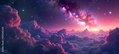 Panoramic view of outer space universe. Nebula, galaxy displayed with vibrant colors. Stars, clouds glowing in cosmic scene. Cosmic view like high-altitude perspective. Mysterious interstellar